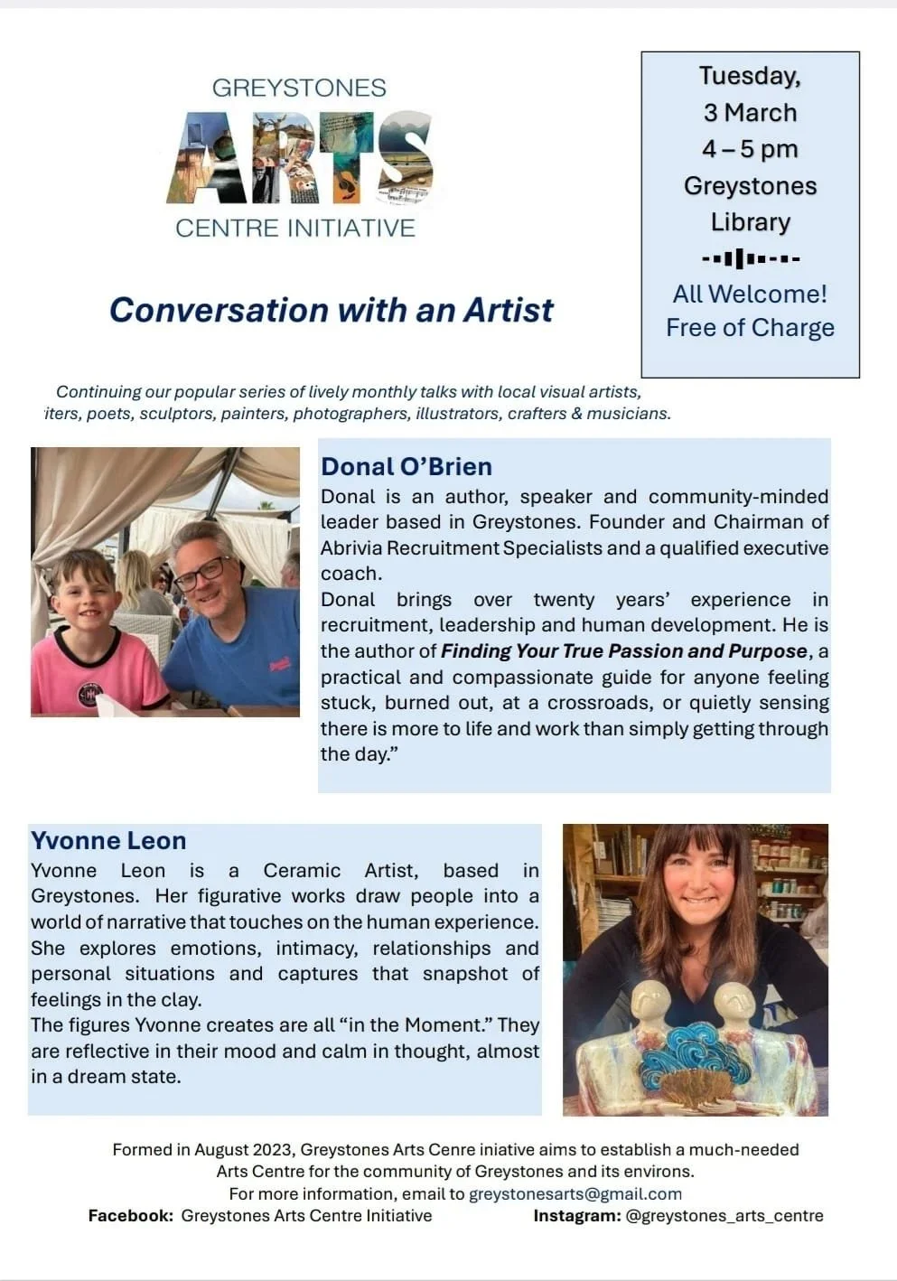 Please join us for our next "Conversation with an Artist" event on February 4th at 4PM on the first floor of the Greystones Library!